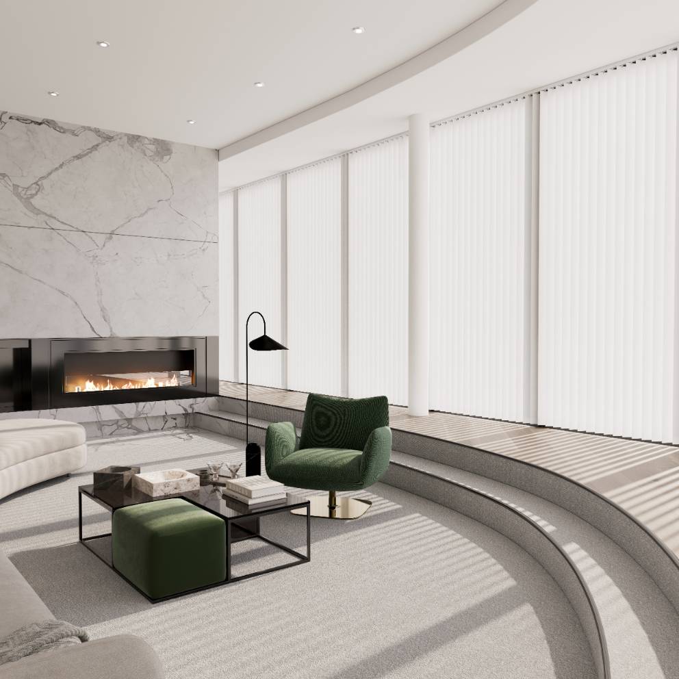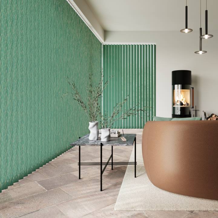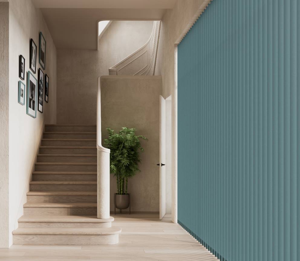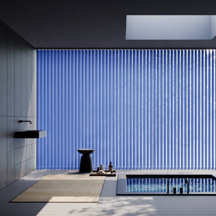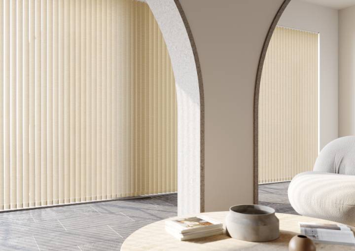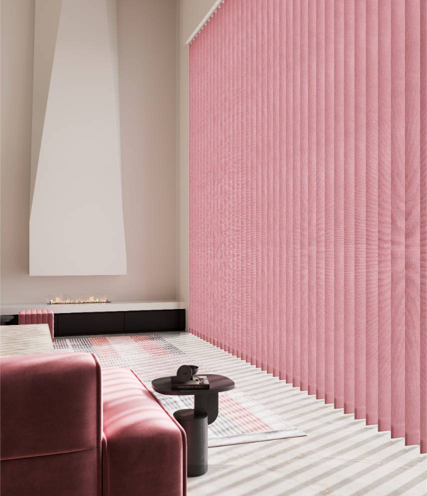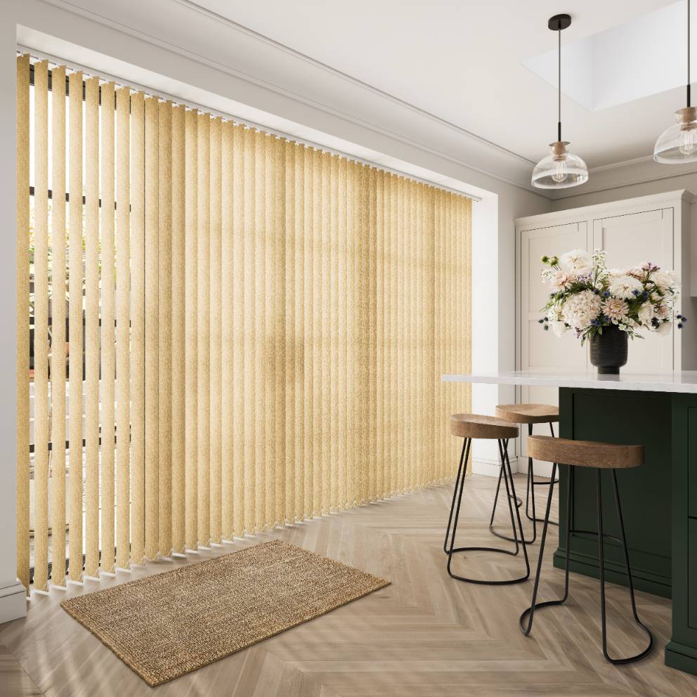 Vertical blinds offer versatile light control and privacy, with the option to angle the slats or fully open them for an unobstructed view. Made to measure in a wide choice of colours, fabrics, and designs, they can be rod-operated for enhanced child safety or motorised for added convenience.